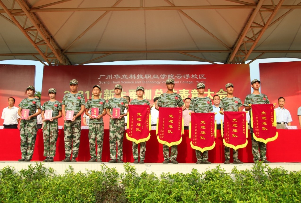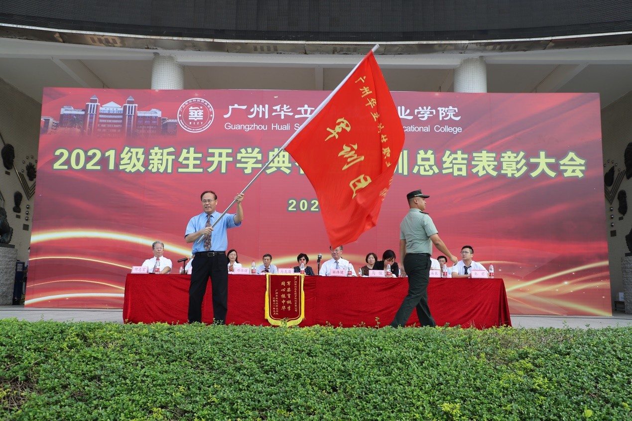 马俊副校长宣读广州校区《关于表彰2021年新生军训先进集体和先进个人的决定》,云浮校区由校长助理郭仲先宣读。学校领导分别向受表彰的单位和个人颁发了锦旗和荣誉证书。
