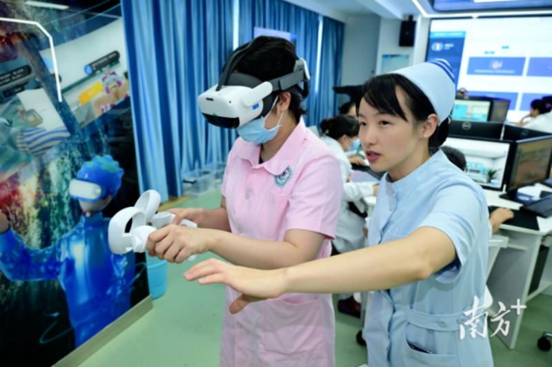 学校教师通过虚拟现实技术开展基层护理技能培训。